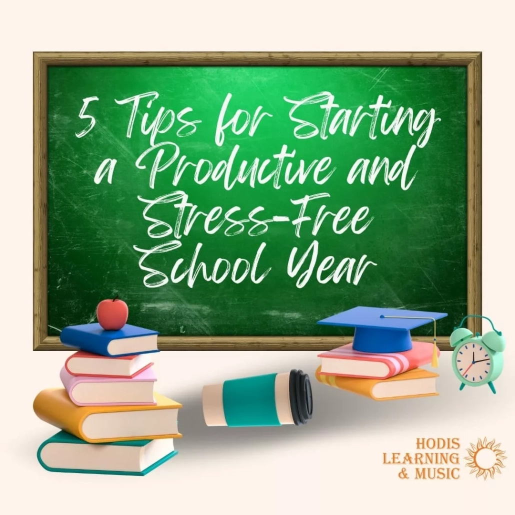 5 Tips for Starting a Productive and Stress-Free School Year. Image shows a chalk board with the blog post's name on it. Books, school supplies, an apple, and a graduation cap can be seen in the photo, along with Hodis Learning & Music's logo.
